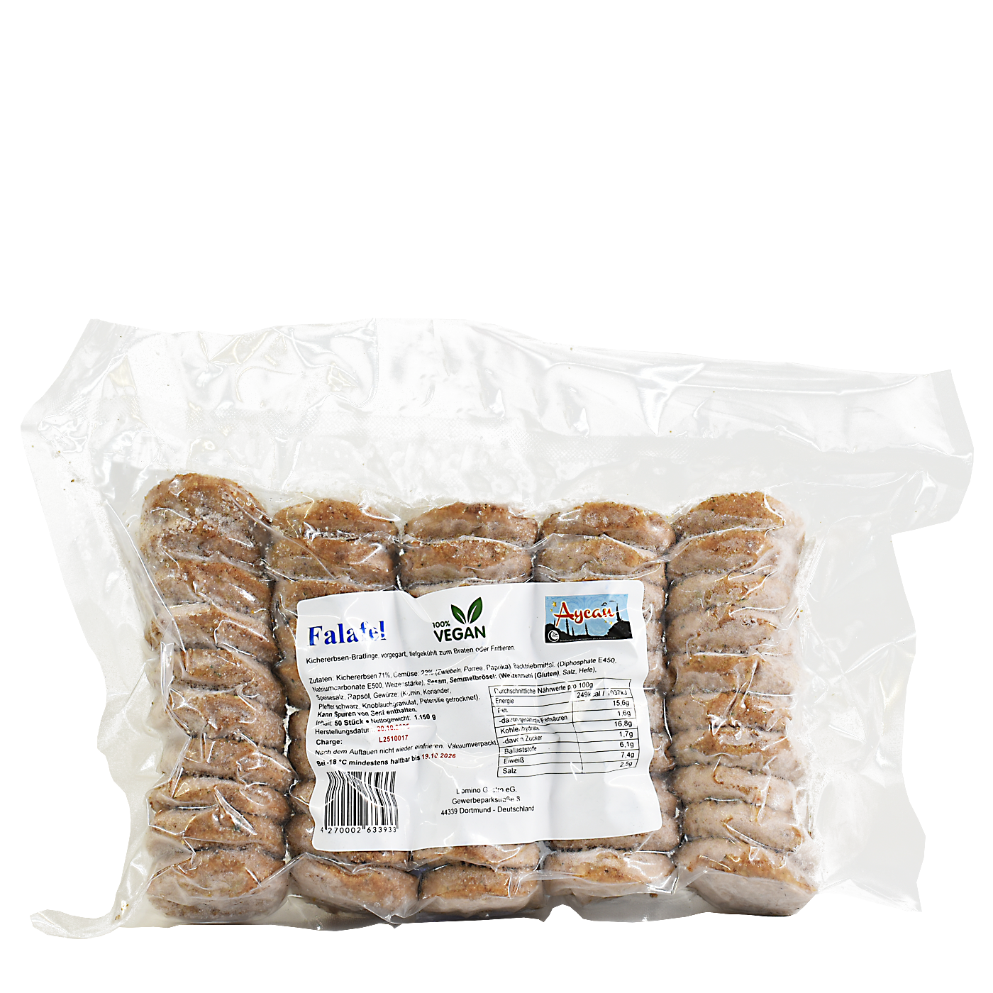 Die Falafel werden in einer Packung mit 50 Stück angeboten und sind tiefgekühlt. Sie bestehen aus einer Mischung aus Kichererbsen, Gewürzen und Kräutern, die zu kleinen Bällchen geformt und vorgegart wurden. Die Falafel eignen sich hervorragend für den professionellen Einsatz in Gastronomie, Imbissbetrieben oder Großküchen. Sie können einfach frittiert oder im Ofen erhitzt werden und eignen sich gut als Snack, Beilage oder in Pita-Broten und Wraps. Alle relevanten Informationen wie Zutaten, Nährwerte, Lagerhinweise (tiefgefroren), Haltbarkeitsdatum und Chargennummer befinden sich auf der Originalverpackung.